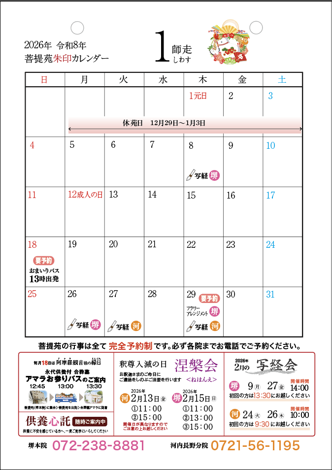 新しい年、令和8年(2026年)が始まります。菩提苑では、新春の写経会や大切な法要である涅槃会(ねはんえ)など、皆様の心に寄り添う行事を予定しております。