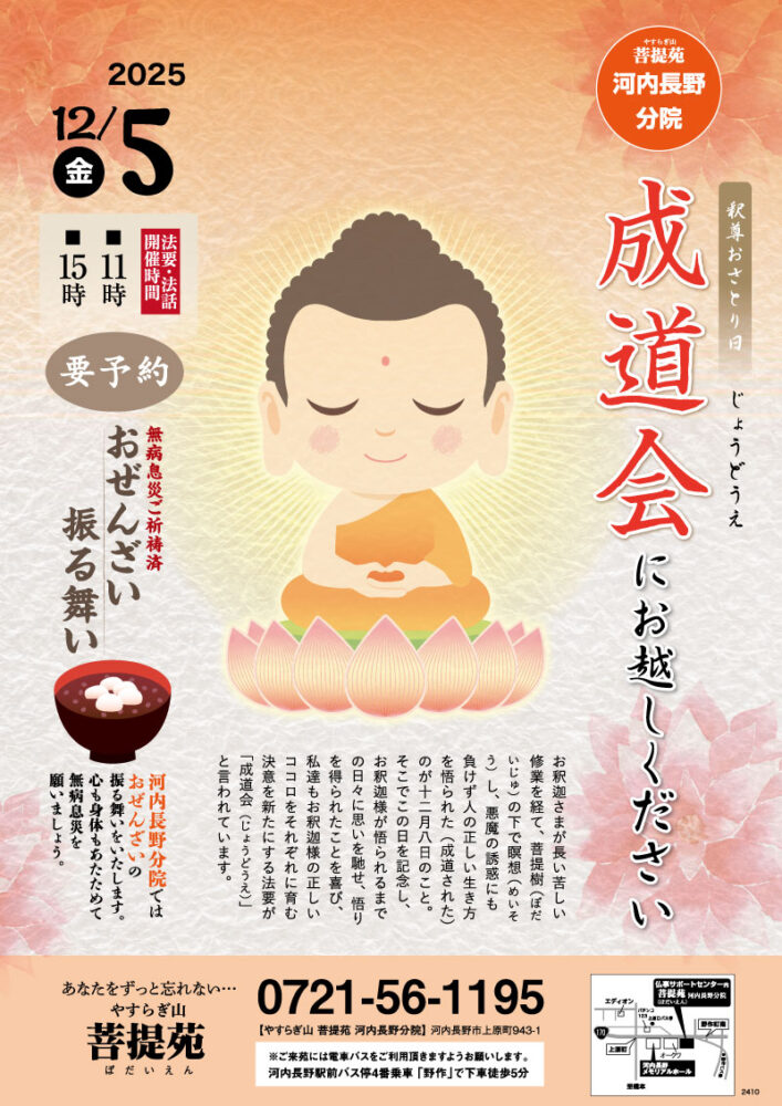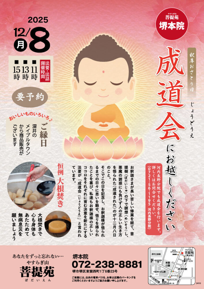 お釈迦さまが悟りを開かれた日「成道会(じょうどうえ)」にあわせ、今年も菩提苑にて 大根焚き(だいこたき) を開催いたします。