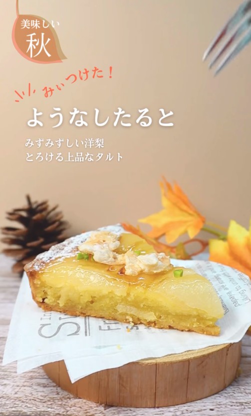 爽やかで上品な甘さの洋梨を贅沢に使ったタルトです。 香ばしいアーモンド生地の上に、みずみずしい洋梨を丁寧に並べて焼き上げました。 口の中でとろけるような滑らかな食感が楽しめる、フルーティーなタルトです。