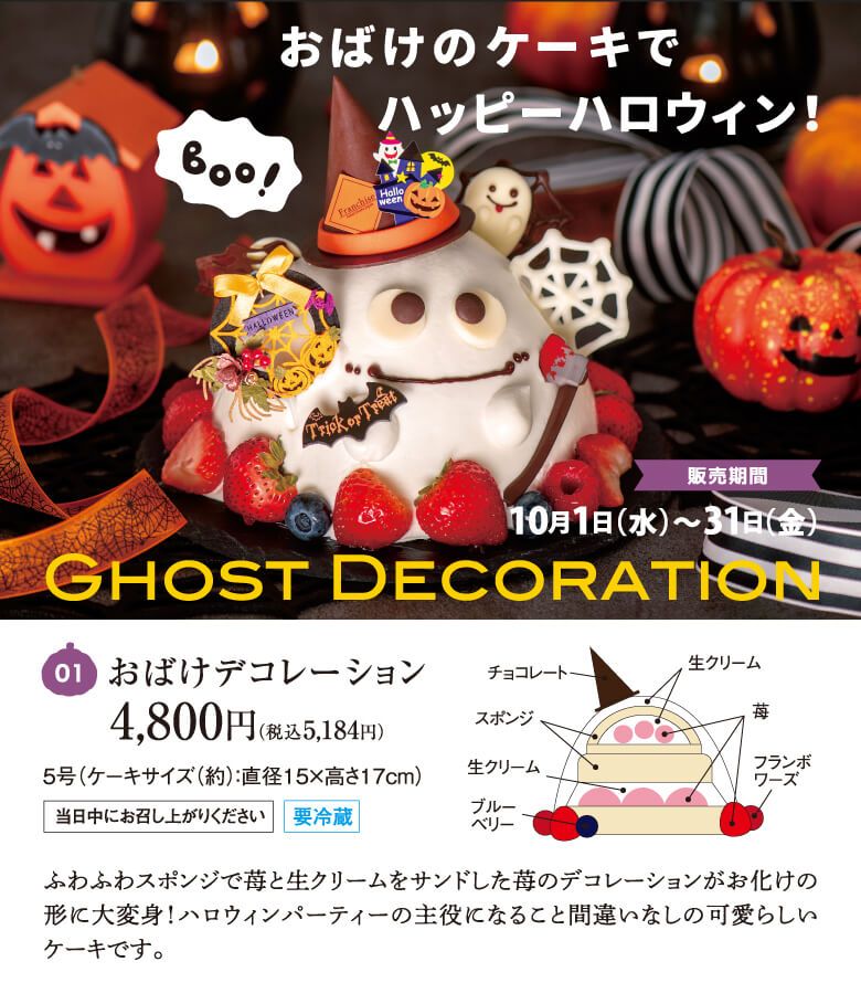 | ハッピーゴースト | 620円 (669円) | 10/1(水)〜31(金) | やわらかくてもっちりとした求肥の中に、バニラムースと苺が隠れています。 |