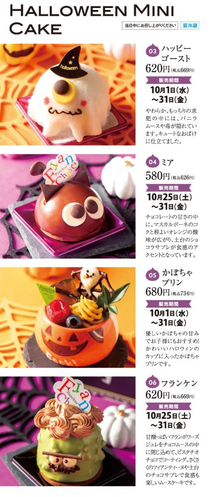 | フランケン | 620円 (669円) | 10/25(土)〜31日(金) | 甘酸っぱいフランボワーズジュレをチョコムースで包み、ピスタチオチョコでコーティング。サクサクのフィアンティーヌとチョコサブレで食感も楽しいムースケーキ。 |