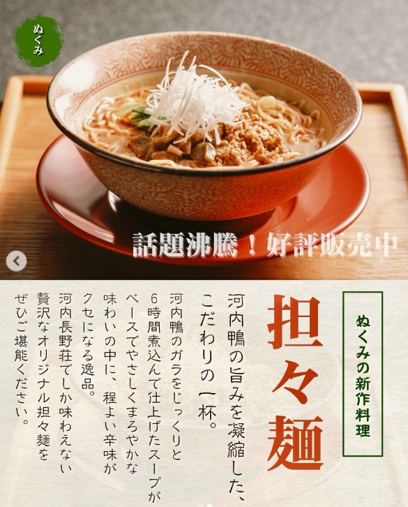 旅の疲れも癒す!レストラン「ぬくみ」の新作・河内鴨担々麺の魅力