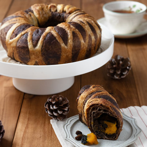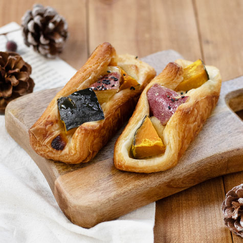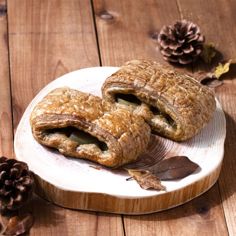 昨年も好評で今年も登場!サクサクのチョコ生地に、ほっこり甘いカボチャ餡を巻き込んだ、見た目にもこだわった贅沢な人気商品です。手土産にもおすすめですよ。