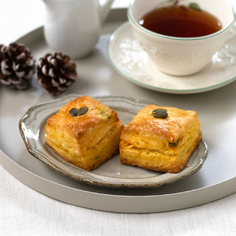 サクサクホロホロ食感がたまらない、カボチャ味のスコーン。見た目もかわいらしく、ちょっとしたおやつにぴったりです。