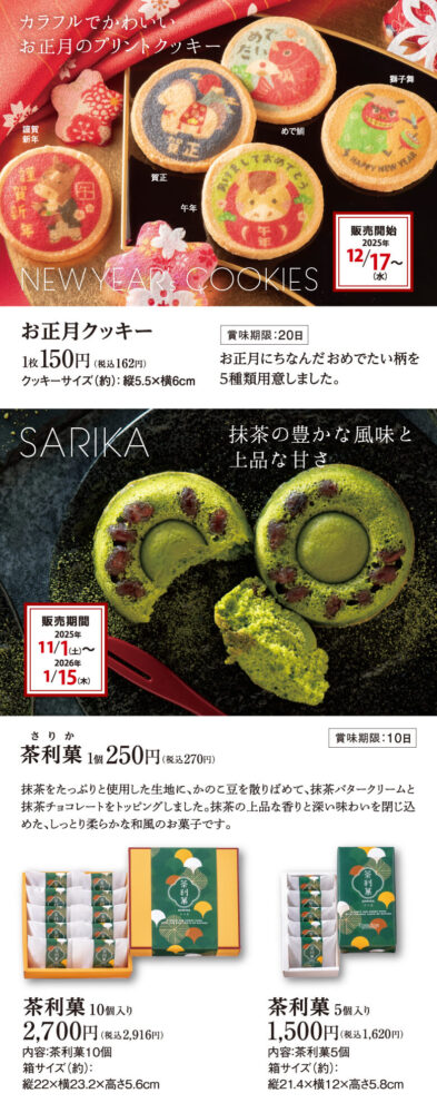 • 茶利菓(さりか)(1個 税込270円〜) 11月から販売されている人気の和風お菓子。抹茶を贅沢に使ったしっとり生地は、お正月の日本茶とも相性抜群です。