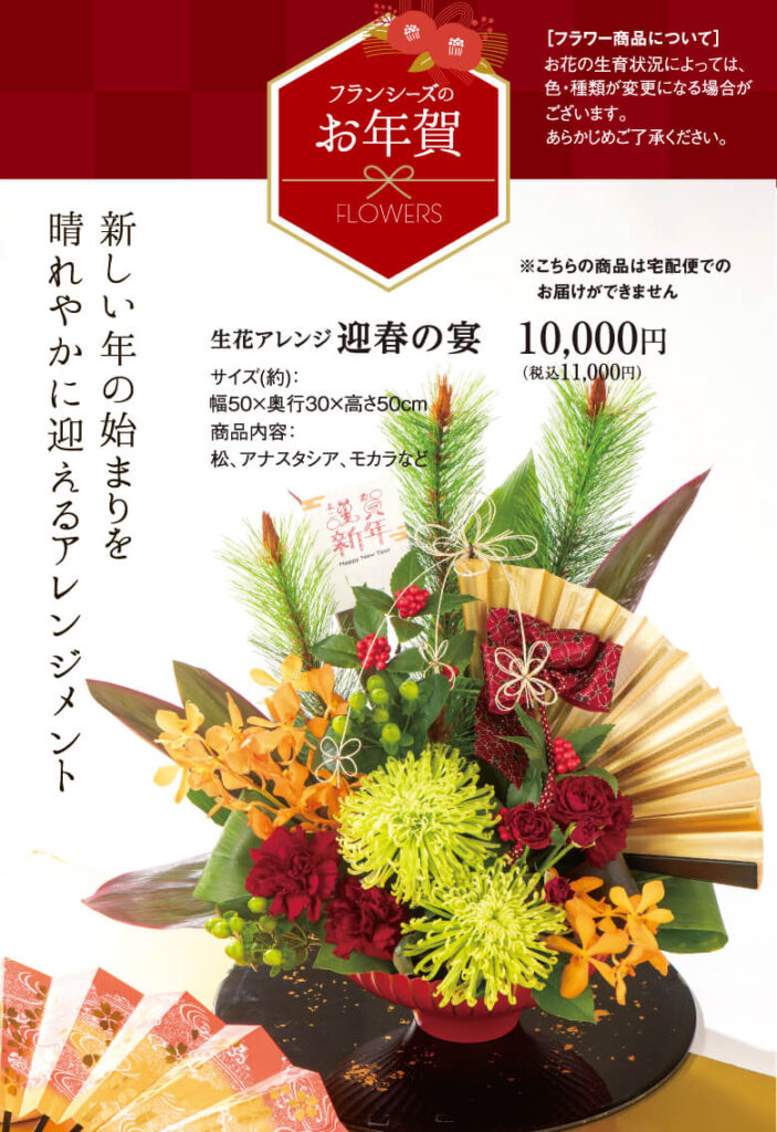 フランシーズといえば、お隣にお花屋さんが併設されている「お花とお菓子の工房」。 店頭では、お正月飾りや華やかなフラワーアレンジメントも揃っています。