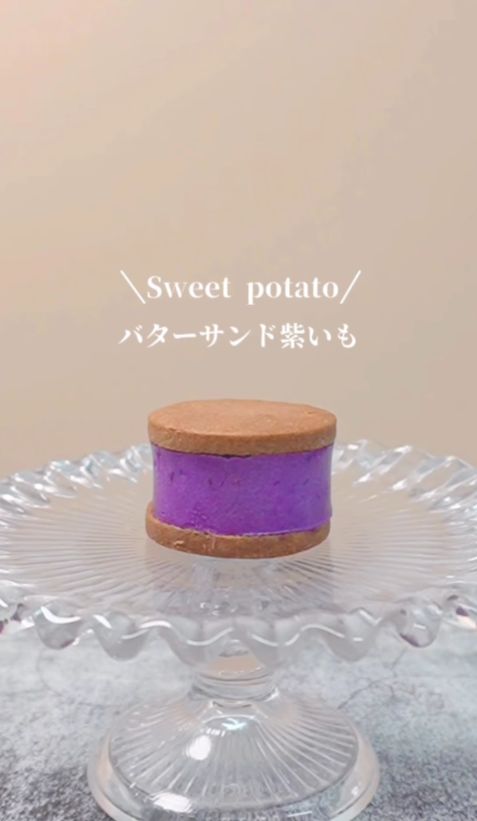 • バターサンド紫いも こちらもショコラサブレ。紫いもの優しい甘さのクリームの中に、鳴門金時芋の甘露煮をIN!お芋の旨味がぎゅっと詰まっています。