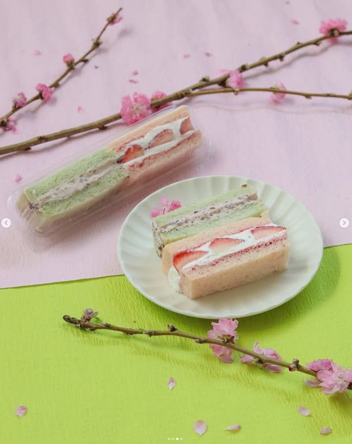 - 華やかサンド:ピンク色の食パンに、あまおうジャムとフレッシュな苺を挟んだ、見た目も愛らしい一品。