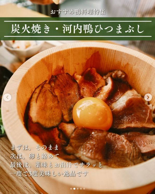 - 炭火焼き・河内鴨ひつまぶし まずはそのまま鴨の旨味を味わい、次はとろ〜り卵と絡めてまろやかに。最後は薬味とお出汁でサラッとお茶漬け風に!一度で3度美味しい、当館イチオシの逸品です。