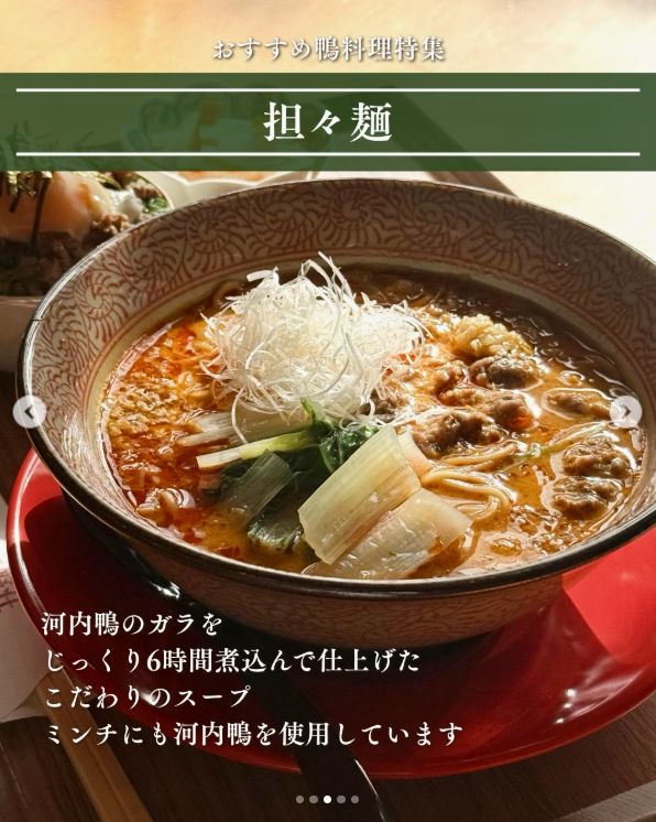 - 担々麺 河内鴨のガラを、なんとじっくり6時間も煮込んで仕上げたこだわりのスープが自慢!トッピングのミンチにも河内鴨を使用しており、旨味とコクがたまりません。