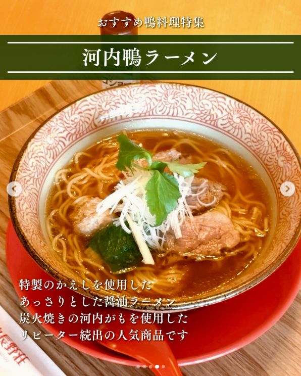 - 河内鴨ラーメン 特製のかえしを使用した、あっさりとした醤油ラーメンです。香ばしい炭火焼きの河内鴨が乗った、リピーター続出の人気メニューです!