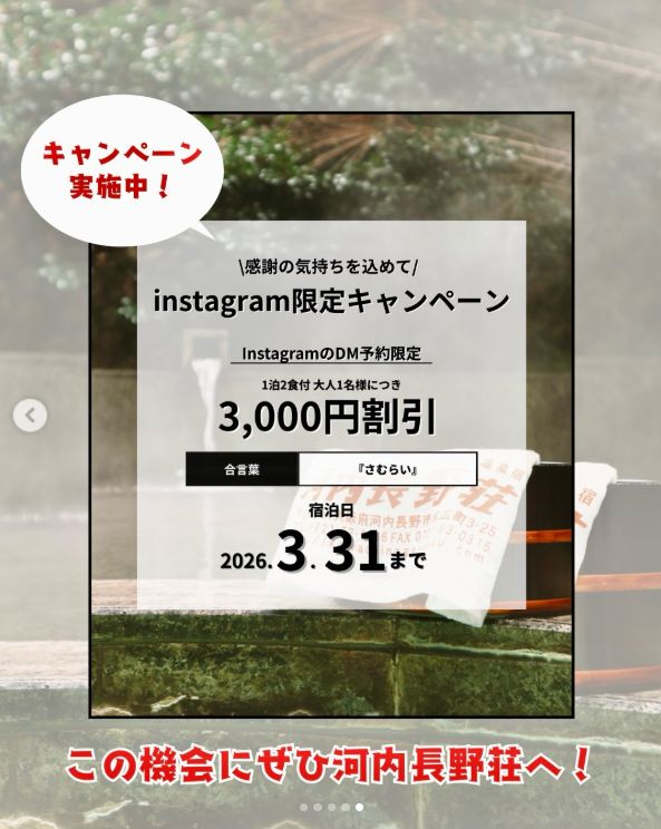 当館の公式Instagramへ「DM(ダイレクトメッセージ)」にてご予約いただくと…… なんと、1泊2食付プランが【大人1名様につき 3,000円割引】となります!!