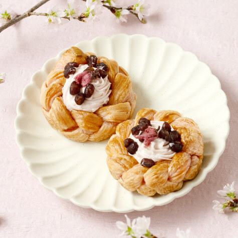 うっすらピンクのクロワッサン生地で可愛らしい籠を表現いたしました!桜風味のホイップとかのこ豆が、まるでお花のように咲いています。