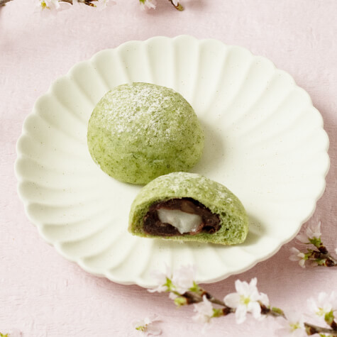 - よもぎあんぱん(税込237円) なんと、生クリームをたっぷり使用した当店自慢の高級食パン『極』の生地を使用!よもぎを練り込み、粒あんと求肥を包み込んだ、もっちり贅沢な和風パンです。