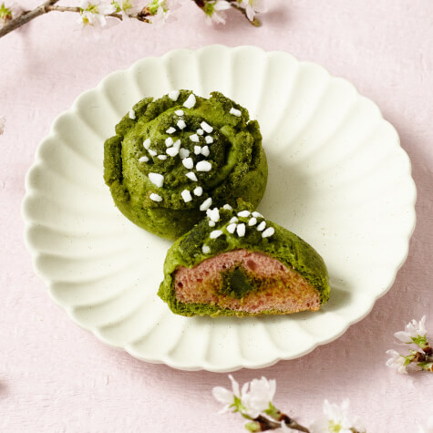 抹茶と桜の生地で抹茶チョコを包み込み、上に抹茶マカロンとワッフルシュガーをトッピングした贅沢な甘さのパンです!