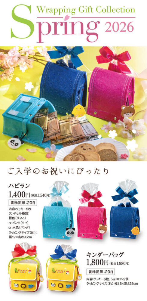 - ハピラン:1,540円(税込) 本物そっくりの可愛いランドセル型ギフト!紺色(ひよこ)、ピンク(クマ)、水色(パンダ)の3種類からお選びいただけます。中には美味しいクッキーが5枚入っていますよ♪