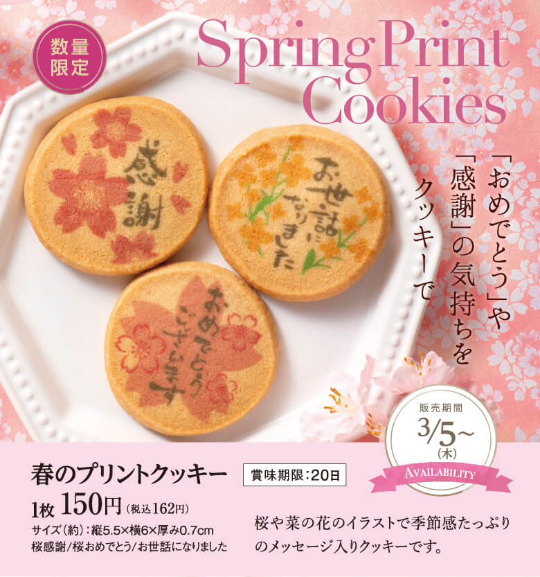 - 春のプリントクッキー:1枚 162円(税込) 「感謝」「お世話になりました」「おめでとうございます」のメッセージがプリントされた、桜や菜の花のイラストが春らしいクッキーです。 ※3月5日より数量限定で絶賛販売中です!