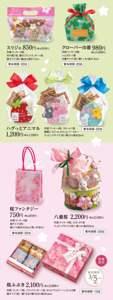 この他にも、「桜ファンタジー(税込810円)」や「クローバー巾着(税込1,058円)」など、多数ご用意しております。数量限定の商品もございますので、ぜひお早めに店頭でご覧くださいませ!