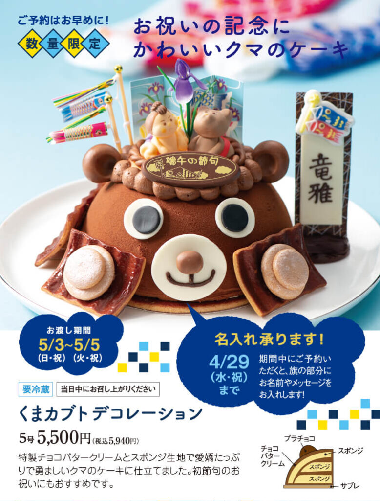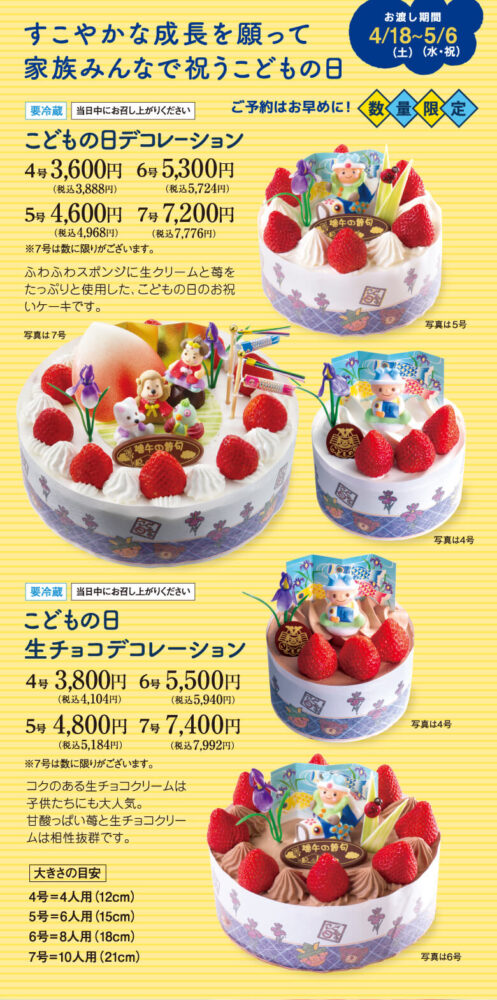 数量限定のサイズもございますので、ぜひお早めにご予約いただき、ご家族でハッピーなこどもの日をお過ごしくださいませ!