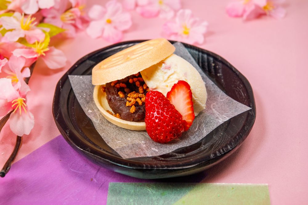 自然な甘さの小豆餡とひんやり冷たい桜アイスを、ぱりぱりの皮で包み込みました。添えられたみずみずしい苺と共に、爽やかな春の風味をご堪能いただけます。