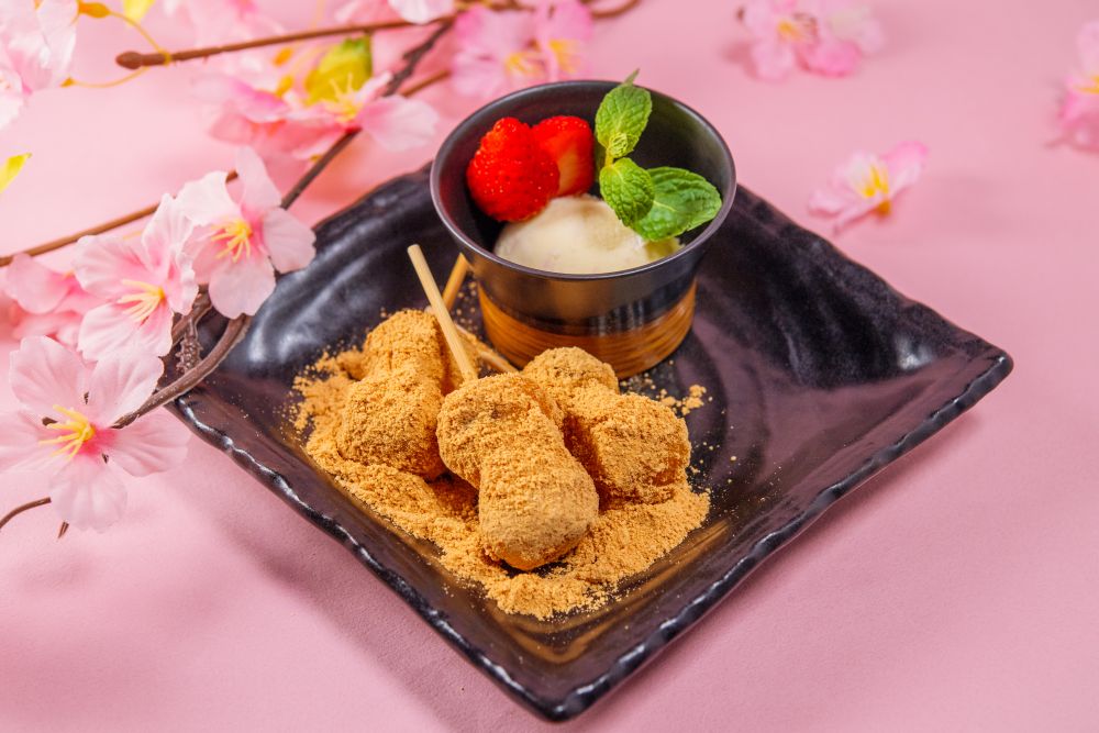 きな粉の香ばしさが食欲をそそるもっちりとしたお団子に、旬の苺と桜アイスを添えた華やかな一皿です。和の甘みと春の彩りを存分にお楽しみください。