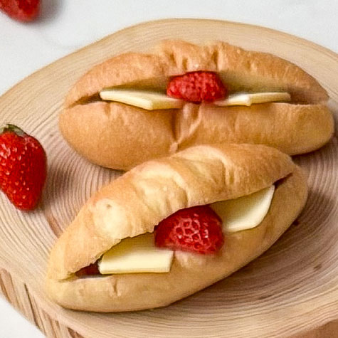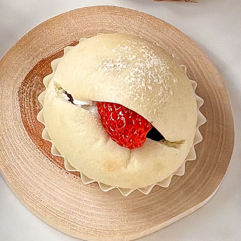 ふんわり白いパン生地でこし餡と求肥を包み込み、仕上げにフレッシュないちごとホイップクリームを挟んだ和洋折衷パン。