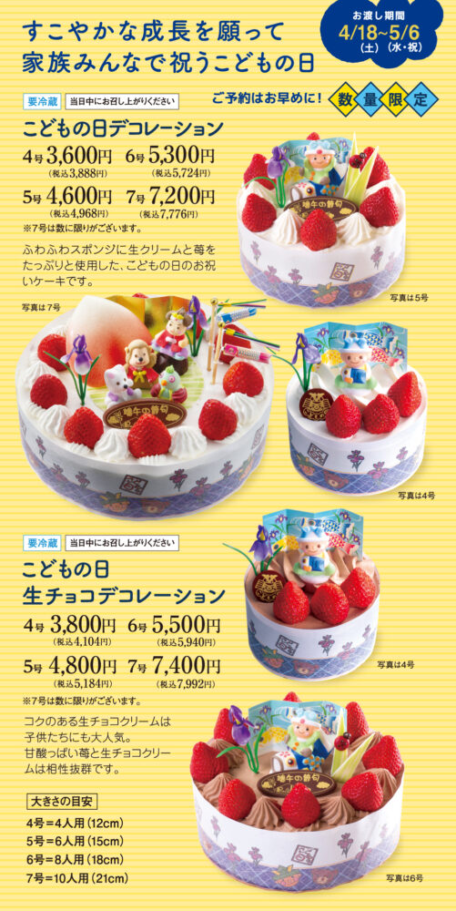 • こどもの日デコレーション 🍓 ふわふわのスポンジに甘酸っぱい苺をサンド。4号から7号までサイズも豊富です!