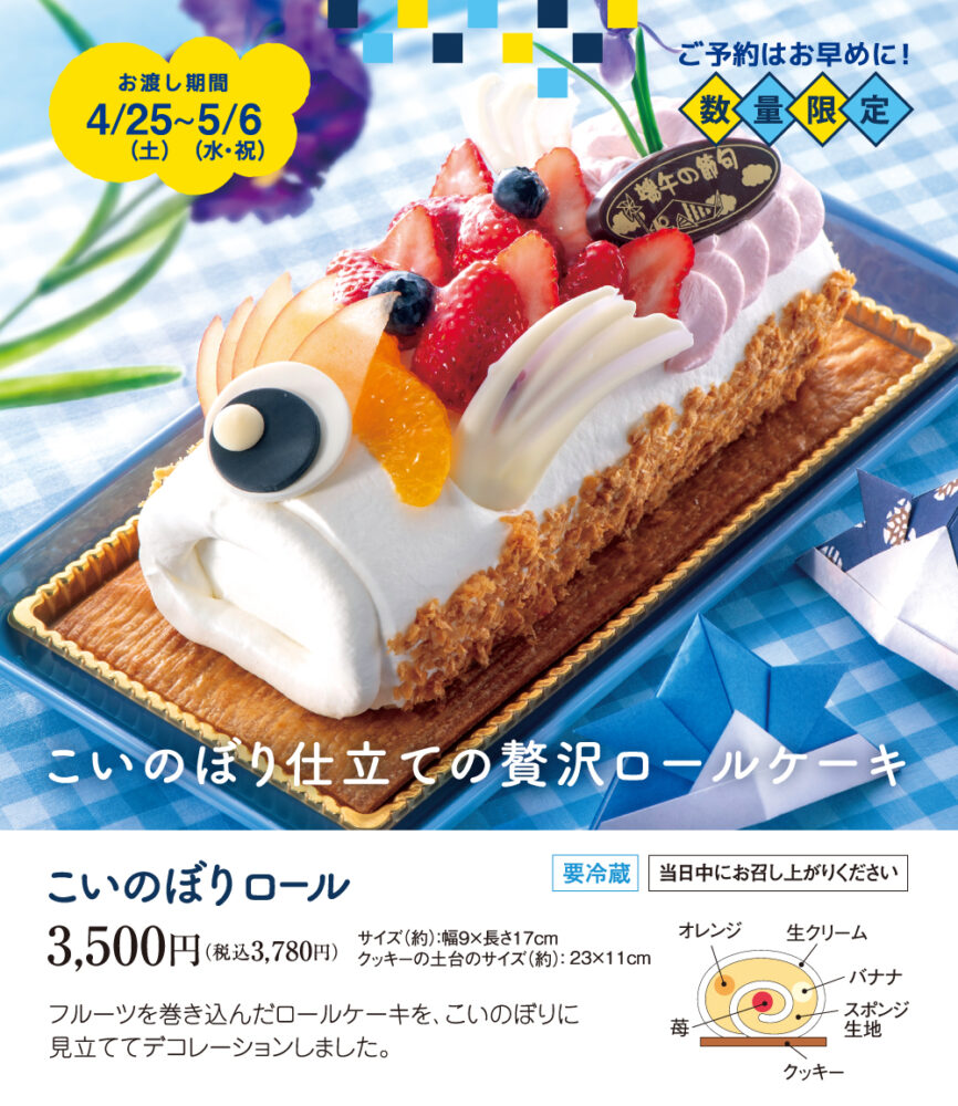 • こいのぼりロール 🎏 苺やフルーツを巻き込んだ贅沢なロールケーキ。大きなこいのぼりのデザインはお子さまも大喜び間違いなし!