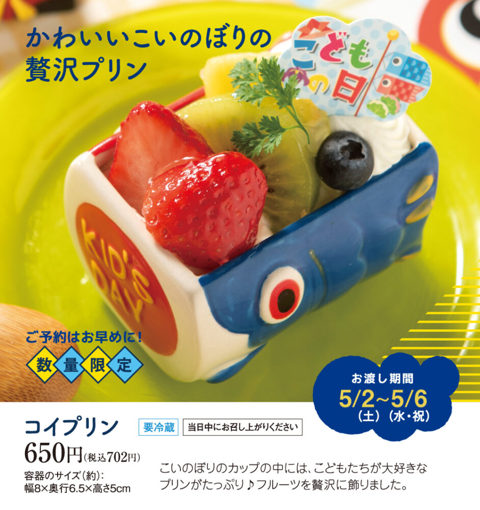 • コイプリン 🍮 こいのぼり型の可愛い陶器に入った、フルーツたっぷりの贅沢プリン。
